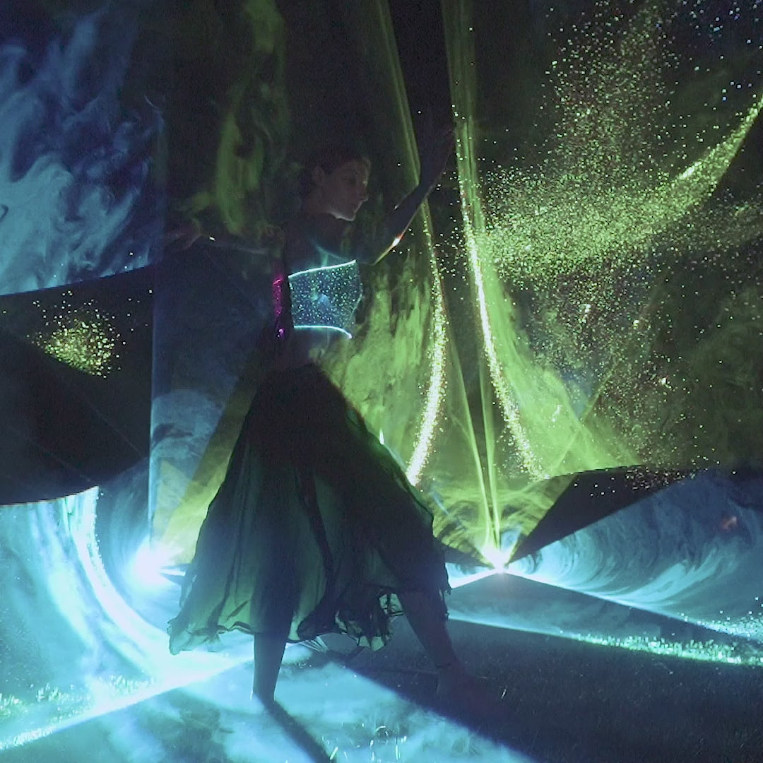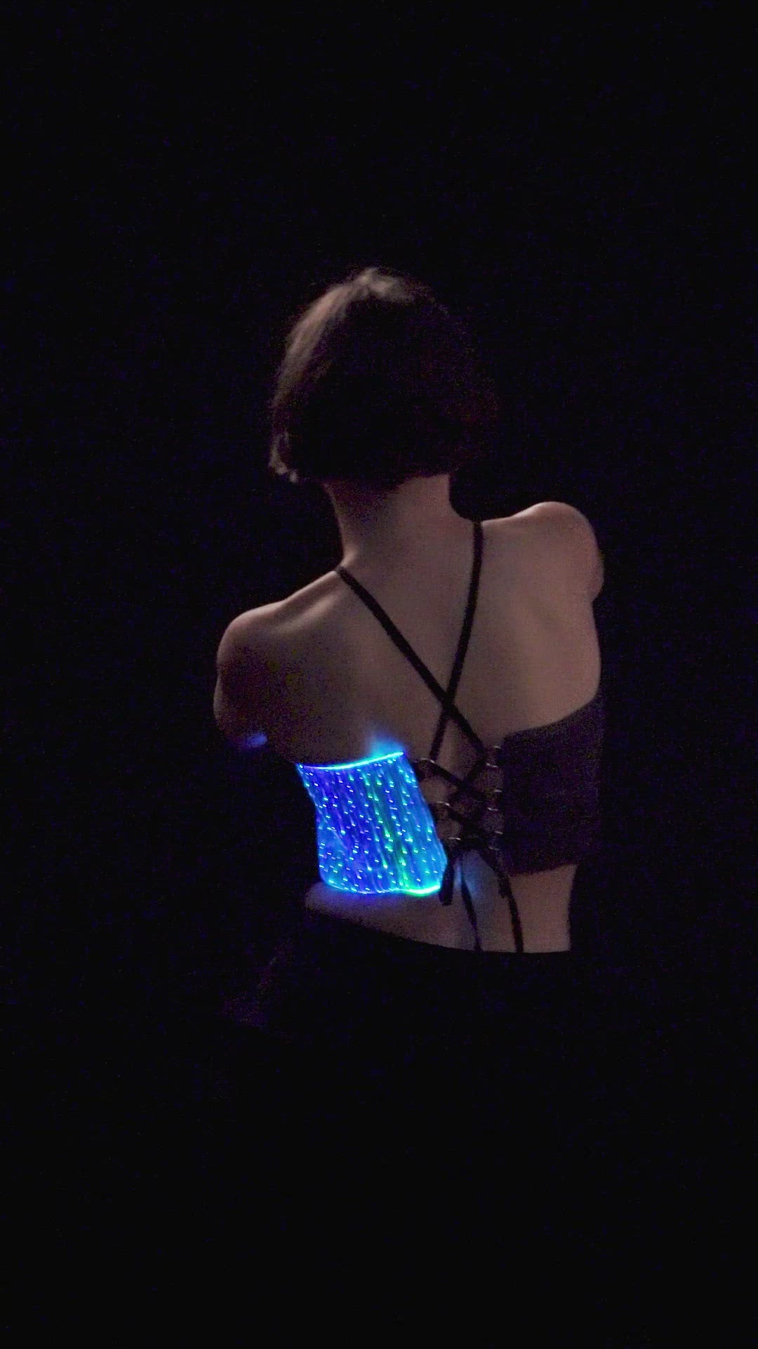 Control more than 50+ color and animation modes directly via built-in Wi‑Fi – no external app required. Activate sound‑reactive modes with the NEBULITE PRO controller to sync your crop top with music beats and bass for fully immersive performances. A slim, integrated, USB‑C rechargeable battery is discreetly hidden at the back and delivers up to 20 hours of illumination (no bulky external power bank).